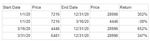If you were unlucky enough to exit your position on the 16th but possessed the mental and financial wherewithal to rebuy into the market, the date on which you regained your position was extremely important. Bitcoin did not recover to the 1 Jan level until 21 April. The longer you waited, the worse your compounded 2020 return became.