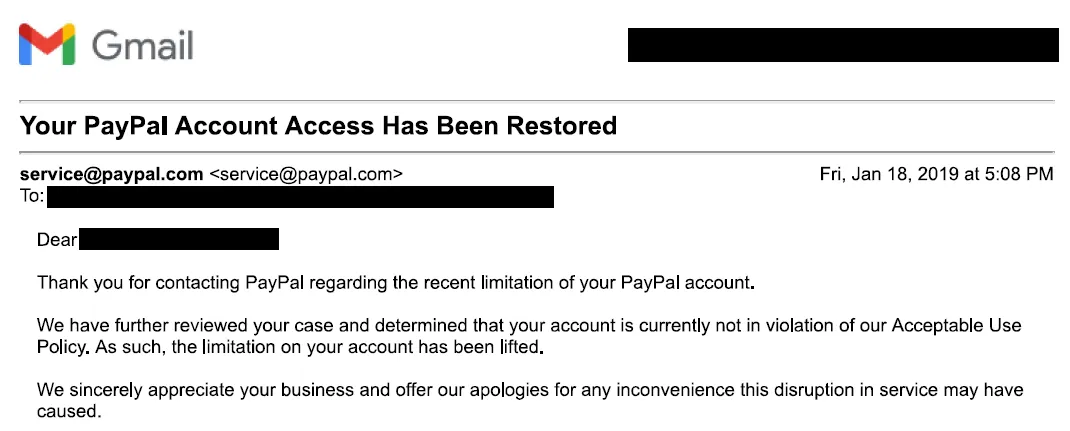On January 22, 2019, I had a few missed calls from the same phone number. The next day, a senior member of PayPal’s legal team emailed me directly to say: