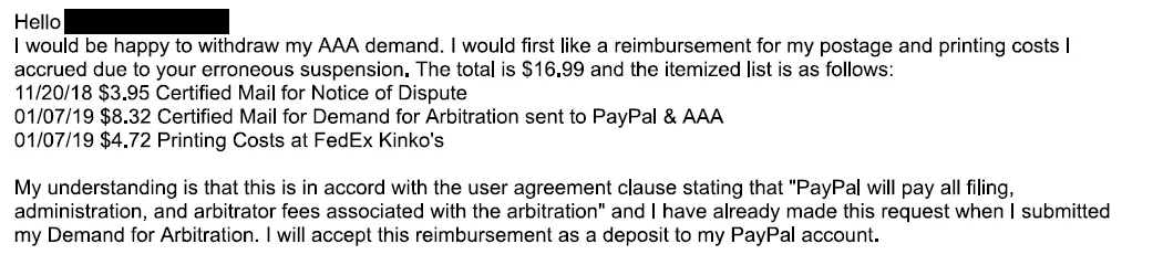 I wasn’t there, so I can only speculate about what transpired. My guess is the bozos at PayPal HQ’s mailroom threw my first letter into a pile somewhere. It wasn’t until I took the unprecedented step of *gasp* following the exact process laid out in their user agreement and demanding arbitration that they got their legal department’s ass into gear. By the terms of their own agreement, PayPal was on the hook to cover the costs of arbitration entirely on their own, and there’s just no way that would have been a worthwhile financial decision when all I was asking for was my pitiful account back. The same thing happened to DoorDash in 2019 and to Amazon in 2021 on a much bigger scale, where they both capitulated after getting swamped by thousands of coordinated arbitration demands.