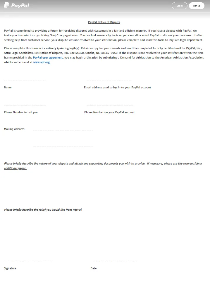 According to the user agreement, the first step on my path to potential redemption was to send PayPal a Notice of Dispute. I had to fill out a form. This is what it looks like in its entirety: