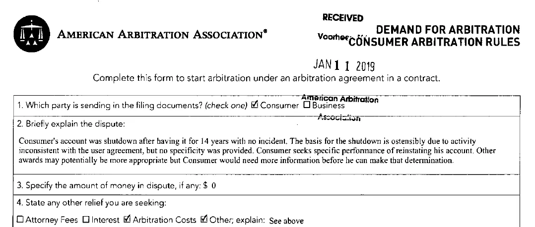 PayPal isn’t alone here as Etsy has basically the same provision, as does Amazon Pay and many others. (Notably, neither Square nor Stripe offer to cover arbitration costs, and Stripe even requires the loser of the dispute to pay the winner’s entire legal expenses. Also notable: Twitter does not require arbitration.) Companies offer to cover the costs of arbitration to avoid having a (real) court strike down the entire agreement as “unconscionable” — essentially saying that the terms are so lopsided that no reasonable consumer would ever have actually agreed to them, AGREE button notwithstanding. My empty PayPal account was definitely worth less than ten thousand big ones, so I had nothing to lose. I filled out the Demand for Arbitration form from the American Arbitration Association (AAA) — again, not a particularly arduous process — and sent it on its merry Certified Mail way on January 4, 2019. Then I waited again.