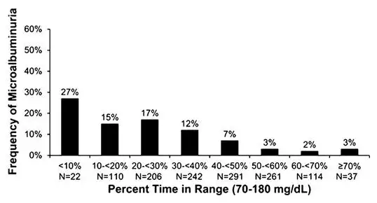 As you can see, a person can maintain an HbA1c of 7% but still have large BGL swings (Glucose Variability GV) and low time-in-range (TIR) . Both bad GV and TIR have been linked to health complications [cite, cite]. For example, here is the relationship between TIR and microalbuminuria (a sign of kidney disease):
