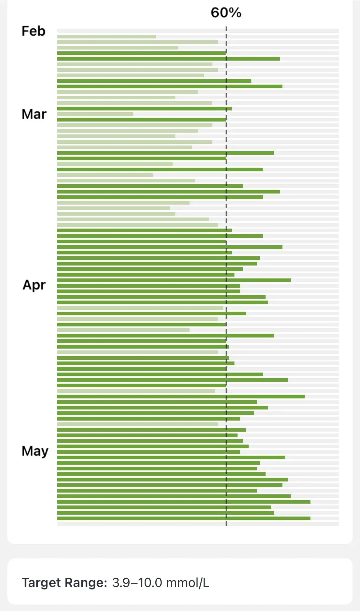 3.9-10mmol/L. This is the main metric we try to improve; a good day is 70%, our best day is 96%. - showing patterns of how insulin and food affect BGL. CGMs show you directly what food and insulin does to you BGL, so you can better adapt.