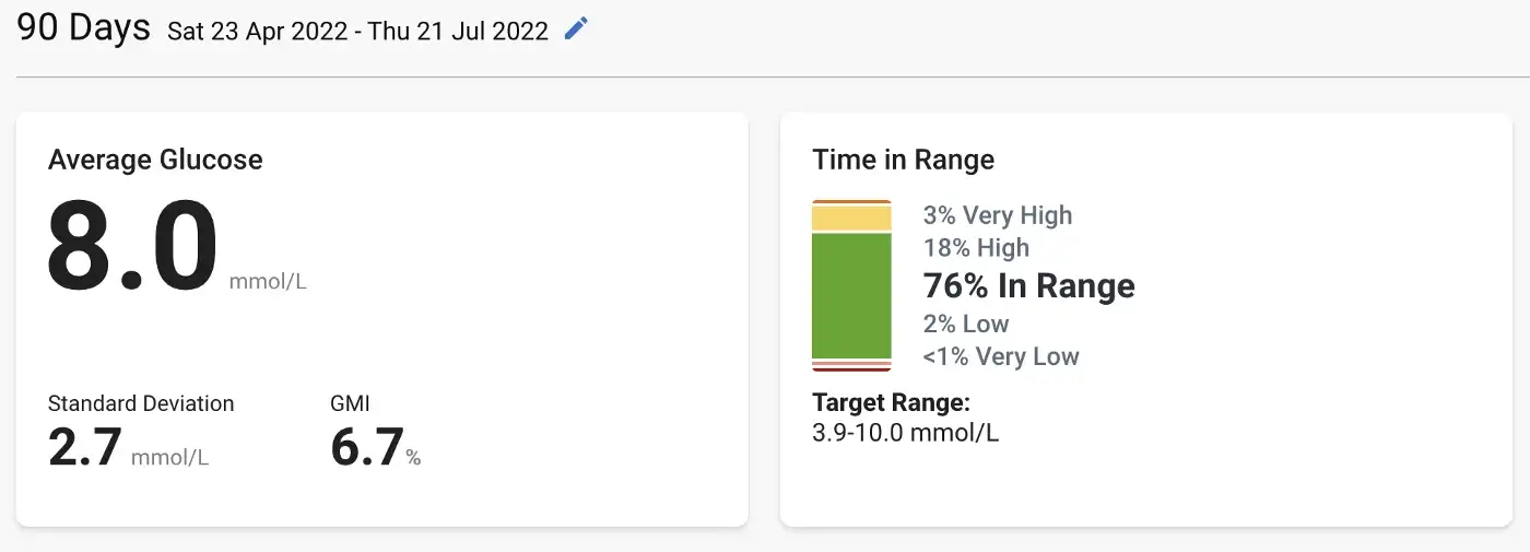 - his Time-In-Range (TIR) is 76%, with 21% above range and 3% below. This is within a recommended range [cite] of 70% TIR, above target less than 25% and 4% below.