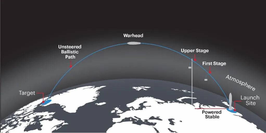 A ballistic missile works in a similar way. For example, the powered and steerable portion of a long-range ballistic missile flight is just four to five minutes long. Whereupon, the warhead is released to travel the remaining 40 to 50 minutes on its own. Just like the baseball above, the warhead’s path is fixed from the moment of release.