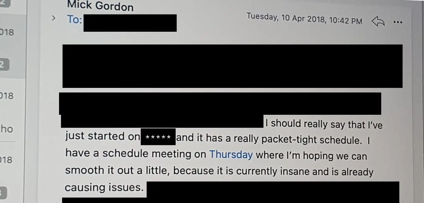 He didn’t reply, but the blow-up made it abundantly clear that the schedule would not change: I was stuck with it. I was already pulling all-nighters two months in, and I still had 18 months to go.
