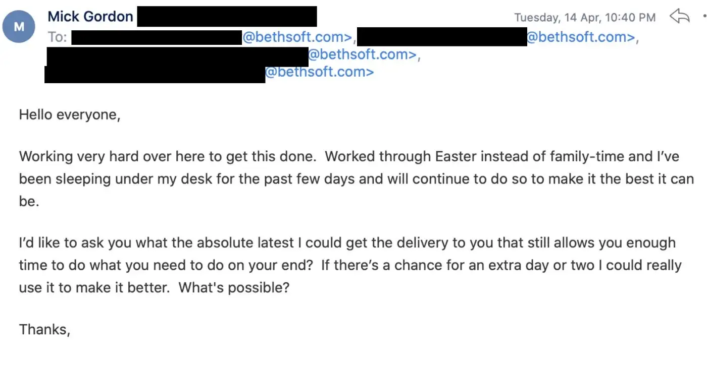 On Reddit, Marty implied that my timeline was much longer, and he claimed that I required several contract extensions that severely impacted the schedule. But the truth is I didn’t sign on until March 18. “January” was when I contacted Bethesda directly, out of desperation, as a last-ditch effort to get around Marty’s months of inaction on the OST.