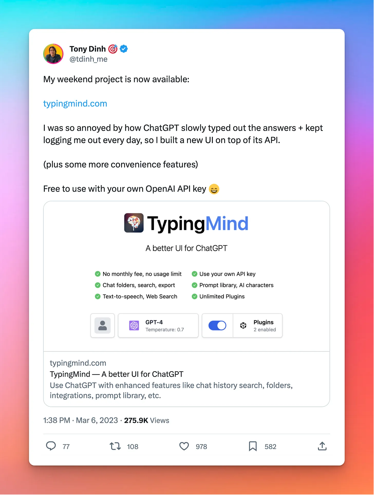 The next day, I registered the domain name typingmind.com and started working on the prototype for a few hours.