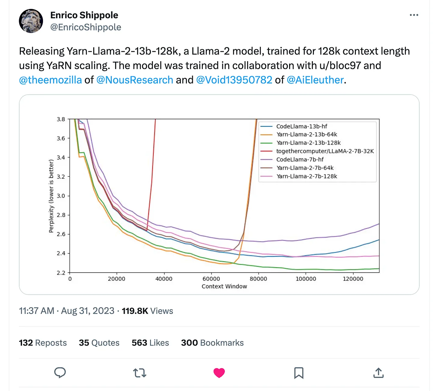 Just last week another indie research project was released, YaRN, that extends Llama 2’s context length to 128k tokens.
