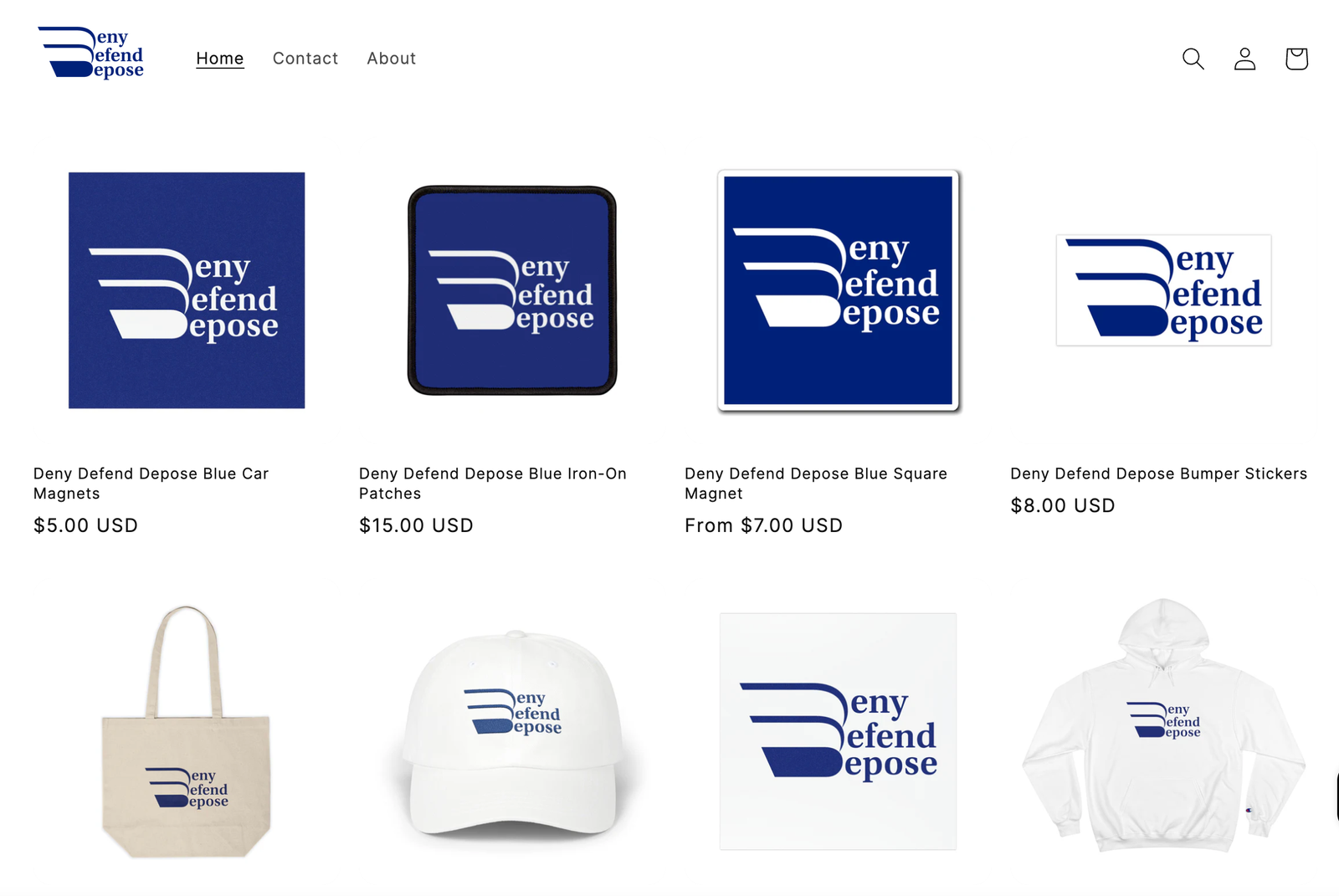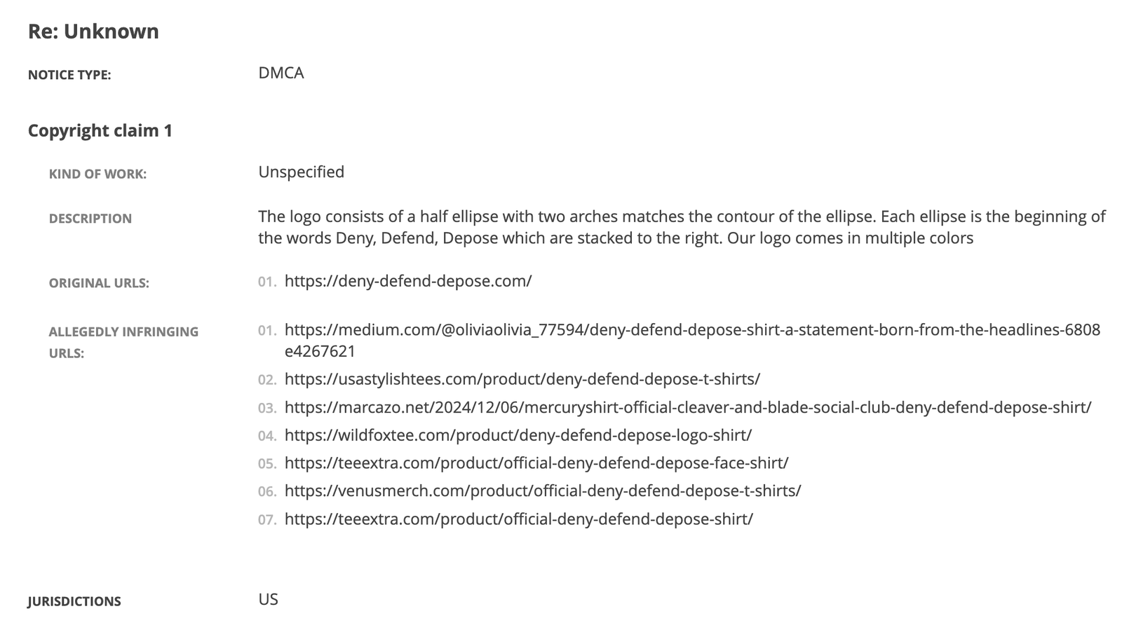 On December 7, someone named Samantha Montoya filed a DMCA takedown with Google that targeted eight websites selling “Deny, Defend, Depose” merch that uses elements of the United Healthcare logo. Montoya’s DMCA is very sparse, according to the copy posted on Lumen: “The logo consists of a half ellipse with two arches matches the contour of the ellipse. Each ellipse is the beginning of the words Deny, Defend, Depose which are stacked to the right. Our logo comes in multiple colors.”