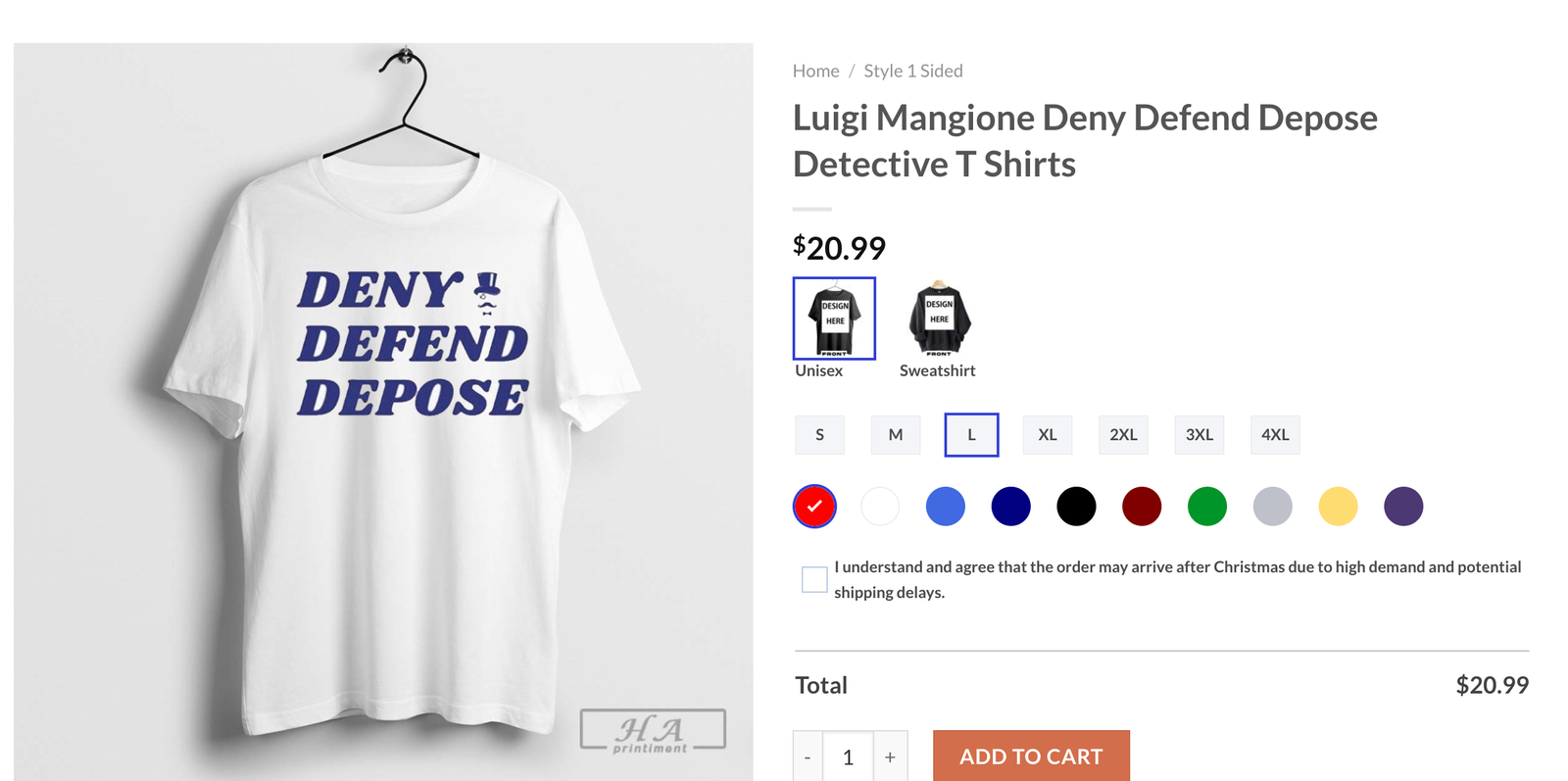 Medium, one of the targeted websites, has deleted the page that the merch was hosted on. It is not clear from the DMCA whether the person filing this is associated with United Healthcare, or whether they are associated with deny-defend-depose.com and are filing against copycats. Deny-defend-depose.com did not respond to a request for comment. Similarly, a DMCA takedown filed by someone named Manh Nguyen targets a handful of “Deny, Defend, Depose” and Luigi Mangione-themed t-shirts on a website called Printiment.com.